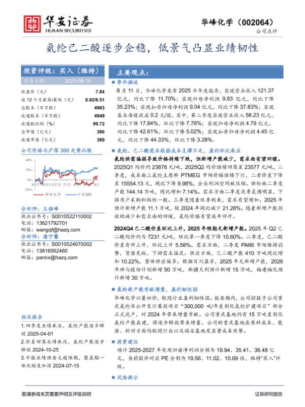 【华安证券】【20250814】氨纶己二酸逐步企稳_低景气凸显业绩韧性-4页 证券期货研究报告