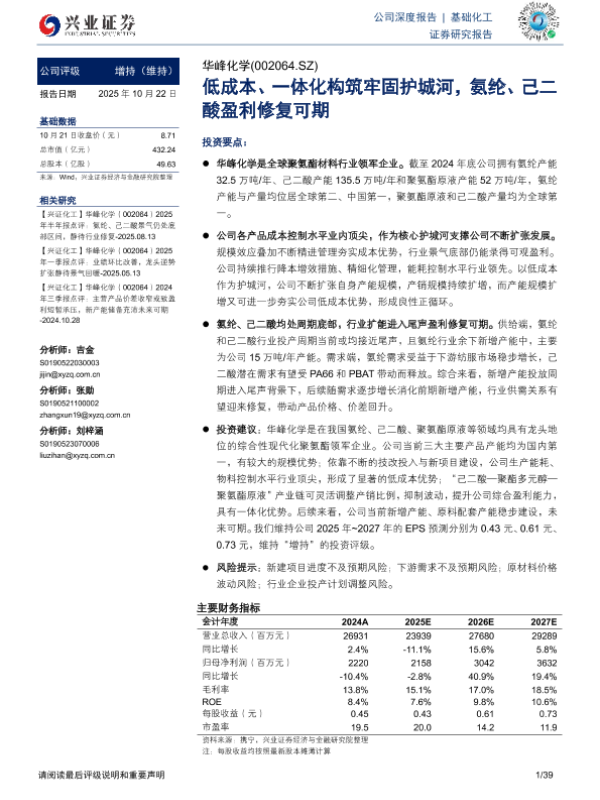 【兴业证券】【202510】低成本、一体化构筑牢固护城河,氨纶、己二酸盈利修复可期-39页 公司研究