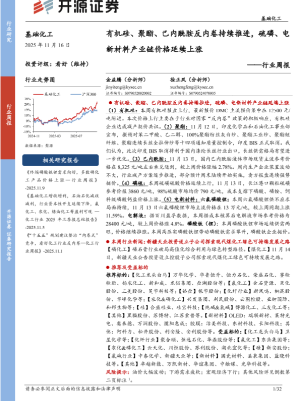 【开源证券】【202511】基础化工行业周报:有机硅、聚酯、己内酰胺反内卷持续推进,硫磷、电新材料产业链价格延续上涨-32页 证券期货研究报告