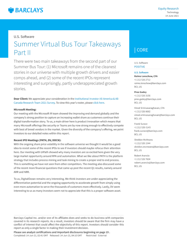 【Barclays Capital Inc.】【20210614】巴克莱-美股软件行业:夏季虚拟巴士之旅要点(II)-28页 行业研究