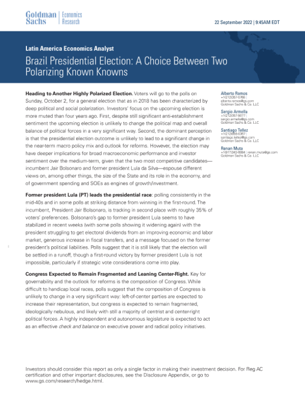 【Goldman Sachs】【20220922】Brazil Presidential Election A Choice Between Two Polarizing Known Knowns-28页 宏观策略
