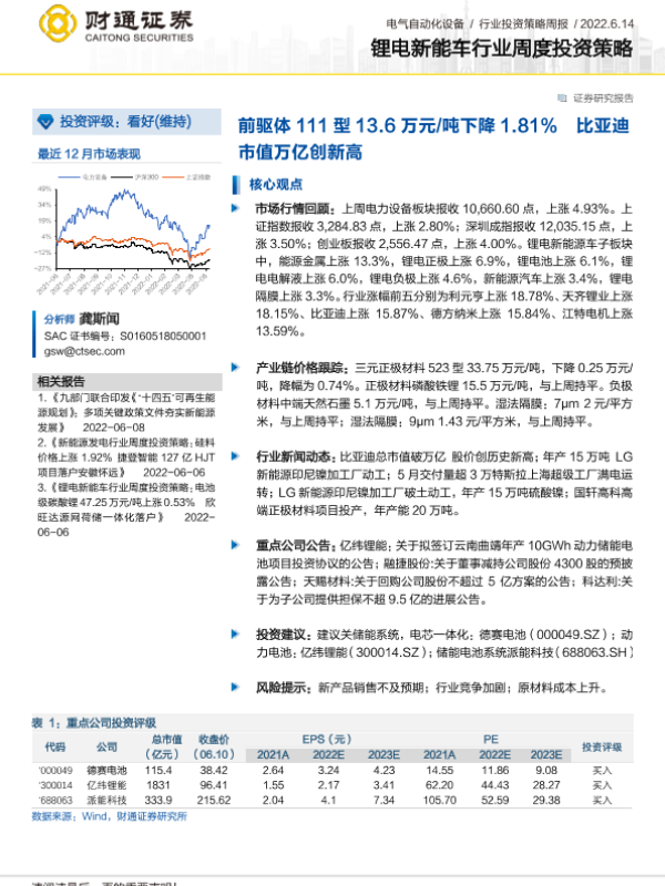 【财通证券】【20220614】锂电新能车行业周度投资策略:前驱体111型13.6万元/吨下降1.81%比亚迪市值万亿创新高-19页 行业研究