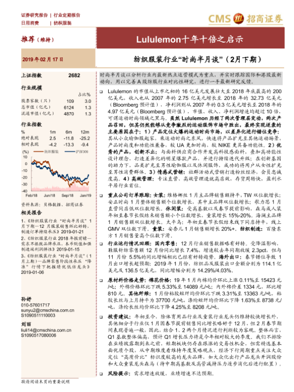 【海通证券】【20190217】纺织服装行业“时尚半月谈”(2月下期):Lululemon十年十倍之启示-30页 行业研究