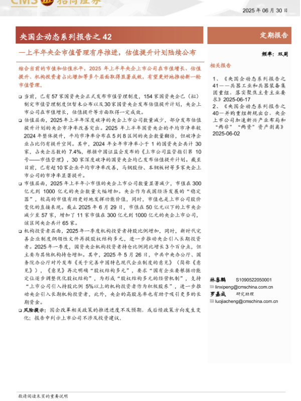 【海通证券】【20250630】央国企动态系列报告之42:上半年央企市值管理有序推进,估值提升计划陆续公布-30页 证券期货研究报告