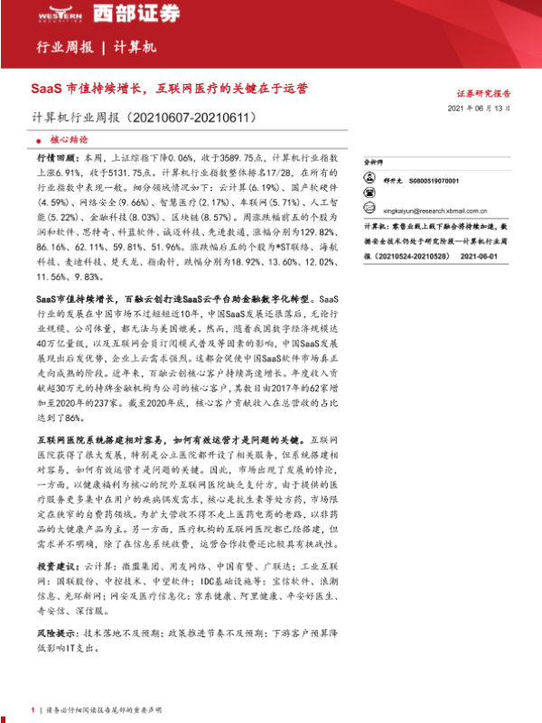 【西部证券】【20210613】20210613-西部证券-计算机行业周报:SaaS市值持续增长,互联网医疗的关键在于运营-16页 行业研究