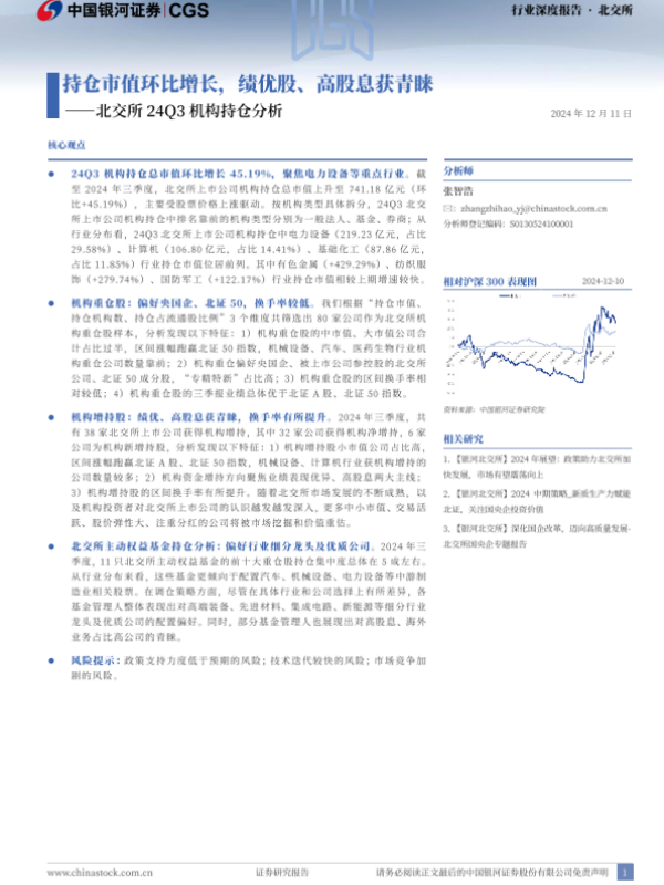 【银河证券】【20241211】北交所24Q3机构持仓分析:持仓市值环比增长,绩优股、高息股获青睐-27页 行业研究