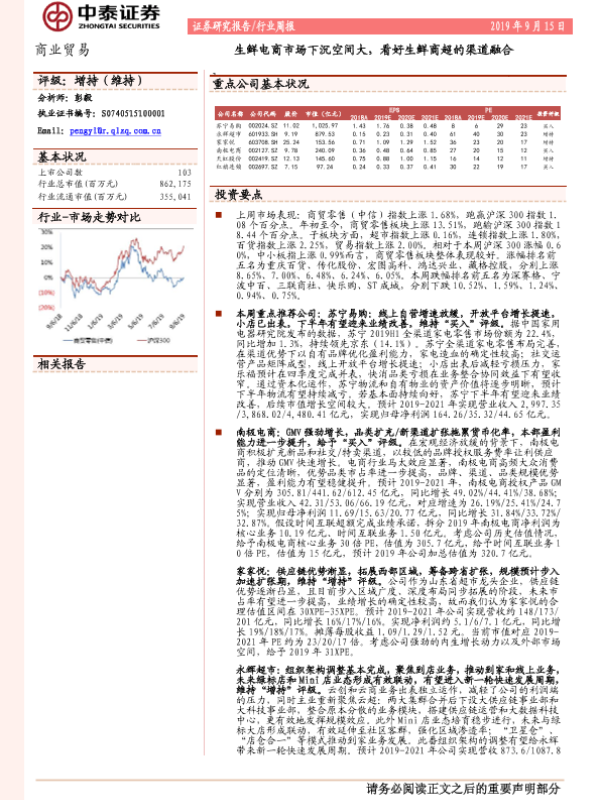 【中泰证券】【20190915】生鲜电商市场下沉空间大,看好生鲜商超的渠道融合-14页 行业研究