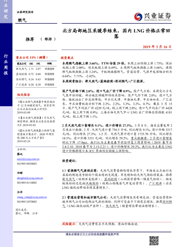 【兴业证券】【20190316】北方局部地区采暖季结束,国内LNG价格正常回落-11页 行业研究