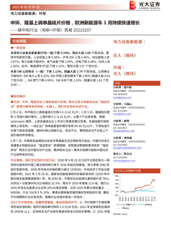【光大证券】【20210207】碳中和行业(电新+环保)周报:中环、隆基上调单晶硅片价格,欧洲新能源车1月持续快速增长-48页 行业研究