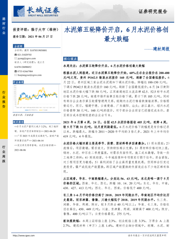 【长城证券】【20210627】水泥第五轮降价开启,6月水泥价格创最大跌幅-21页 行业研究