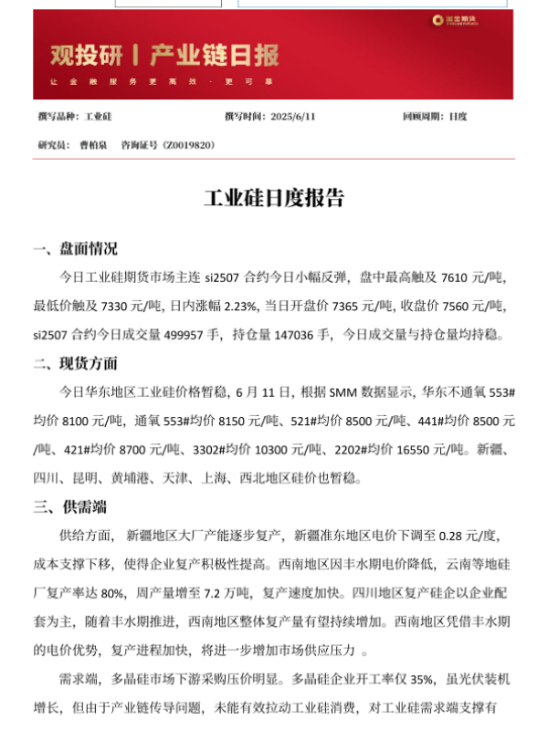 【国金期货】【20250611】工业硅日度报告-3页 证券期货研究报告