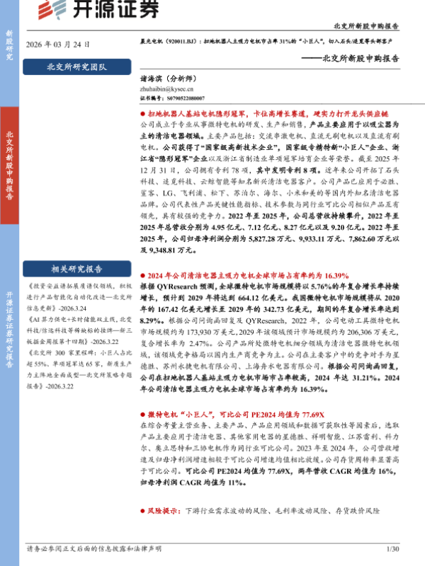 【开源证券】【202603】北交所新股申购报告:扫地机器人主吸力电机市占率31%的“小巨人”,切入石头_追觅等头部客户-30页 证券期货研究报告