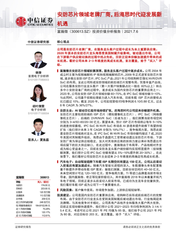 【中信证券】【20210706】20210706-中信证券-富瀚微-300613.SZ-投资价值分析报告:安防芯片领域老牌厂商,后海思时代迎发展新机遇-33页 行业研究