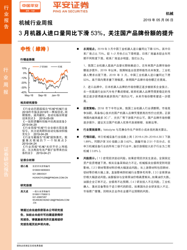 【平安证券】【20190506】机械行业周报:3月机器人进口量同比下滑53%,关注国产品牌份额的提升-4页 行业研究