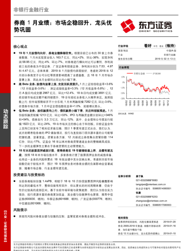 【东方证券】【20190213】非银行金融行业动态跟踪:券商1月业绩:市场企稳回升,龙头优势巩固-5页 行业研究