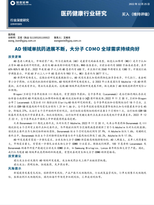 【国金证券】【20221225】医药健康行业研究:AD领域单抗药进展不断,大分子CDMO全球需求持续向好-22页 行业研究