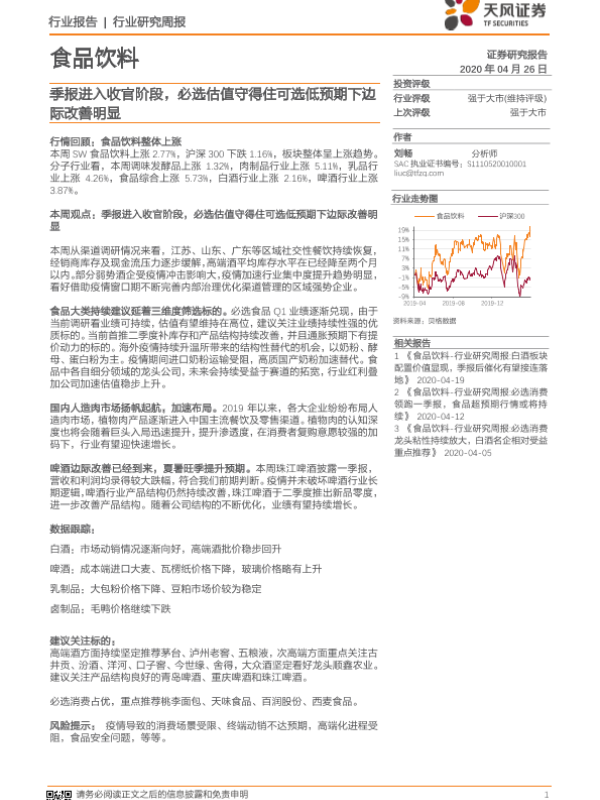 【天风证券】【20200426】20200426-天风证券-食品饮料行业周报:季报进入收官阶段,必选估值守得住可选低预期下边际改善明显-12页 行业研究