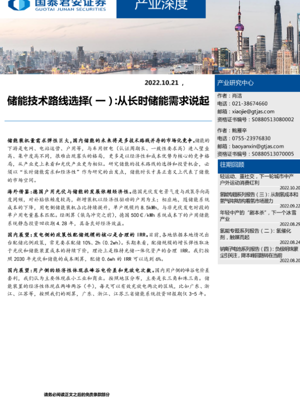 【国泰君安证券】【20221021】产业深度:储能技术路线选择(一),从长时储能需求说起-18页 行业研究