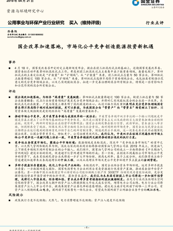 【国金证券】【20190421】公用事业与环保产业行业研究:国企改革加速落地,市场化公平竞争创造能源投资新机遇-3页 行业研究