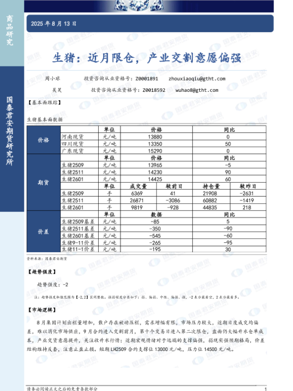 【国泰君安期货】【20250813】生猪:近月限仓,产业交割意愿偏强-2页 证券期货研究报告