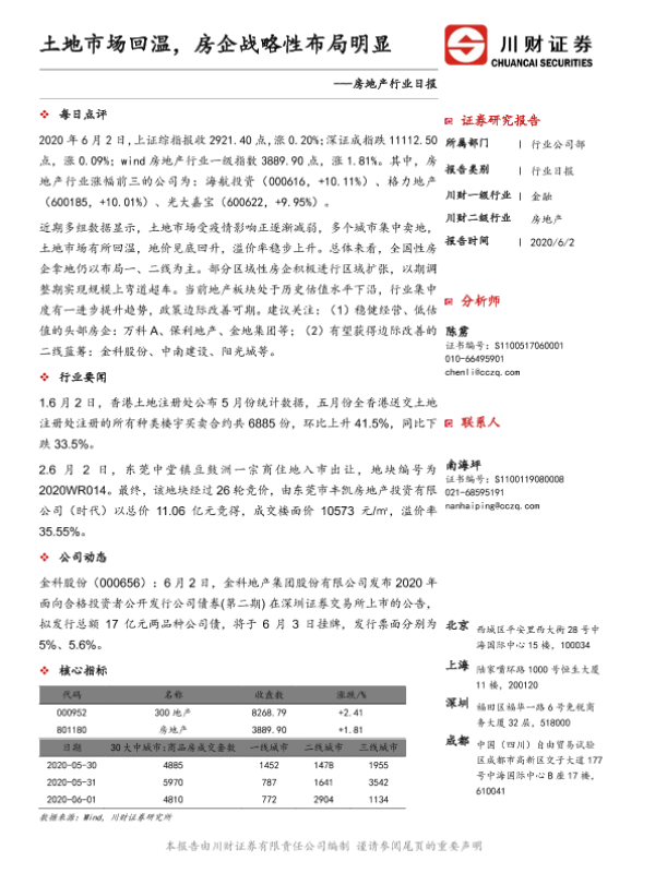 【川财证券】【20200602】房地产行业日报:土地市场回温,房企战略性布局明显-3页 证券期货研究报告