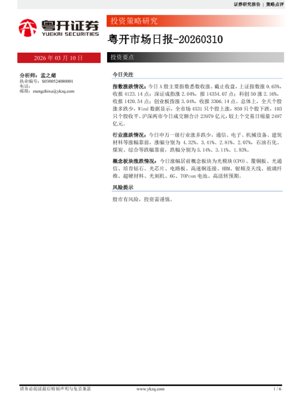 【粤开证券】【202603】粤开市场日报-20260310-6页 证券期货研究报告