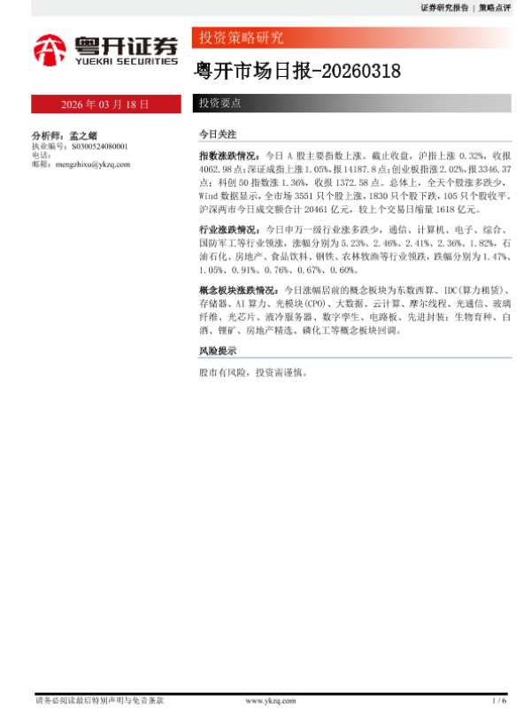【粤开证券】【202603】粤开市场日报-20260318-6页 证券期货研究报告