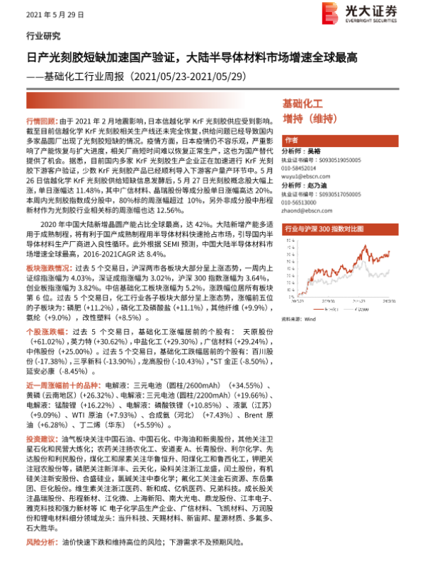 【光大证券】【20210529】基础化工行业周报:日产光刻胶短缺加速国产验证,大陆半导体材料市场增速全球最高-24页 行业研究