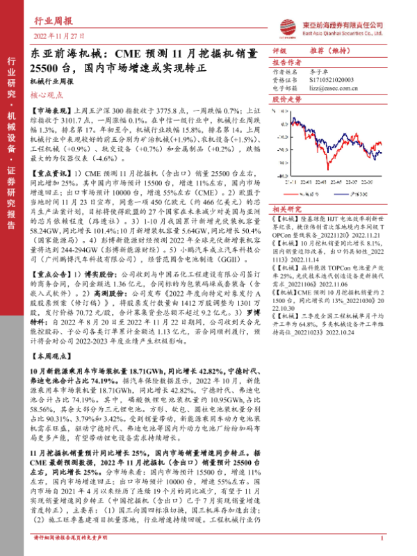 【东亚前海证券】【20221127】东亚前海机械:CME预测11月挖掘机销量25500台,国内市场增速或实现转正-18页 行业研究