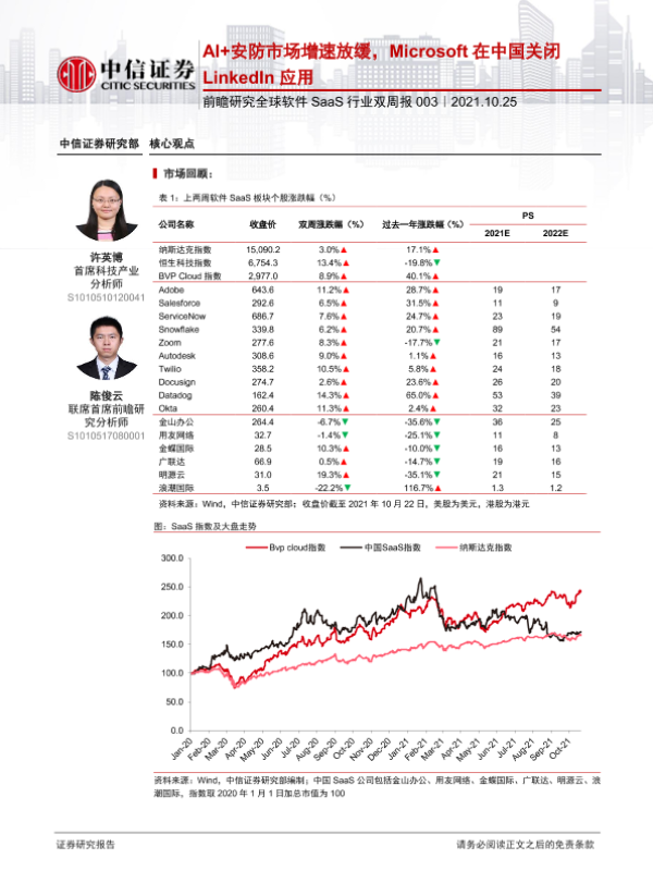 【中信证券】【20211025】20211025-中信证券-前瞻研究全球软件SaaS行业双周报:AI+安防市场增速放缓,Microsoft在中国关闭LinkedIn应用-21页 行业研究