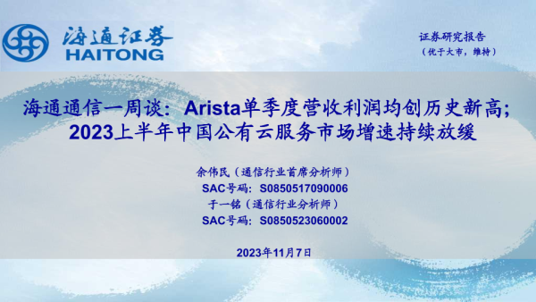 【海通证券】【20231107】海通通信一周谈:Arista单季度营收利润均创历史新高;2023上半年中国公有云服务市场增速持续放缓-12页 行业研究