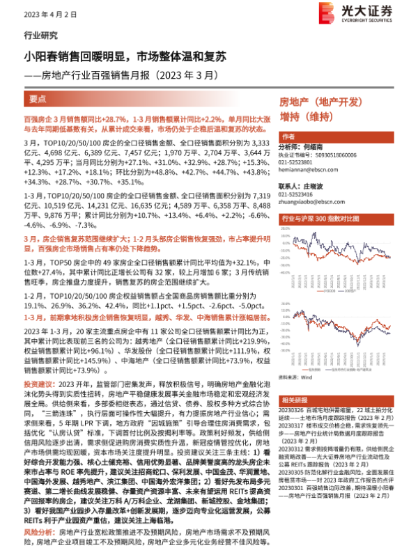 【光大证券】【20230402】房地产行业百强销售月报(2023年3月):小阳春销售回暖明显,市场整体温和复苏-11页 行业研究