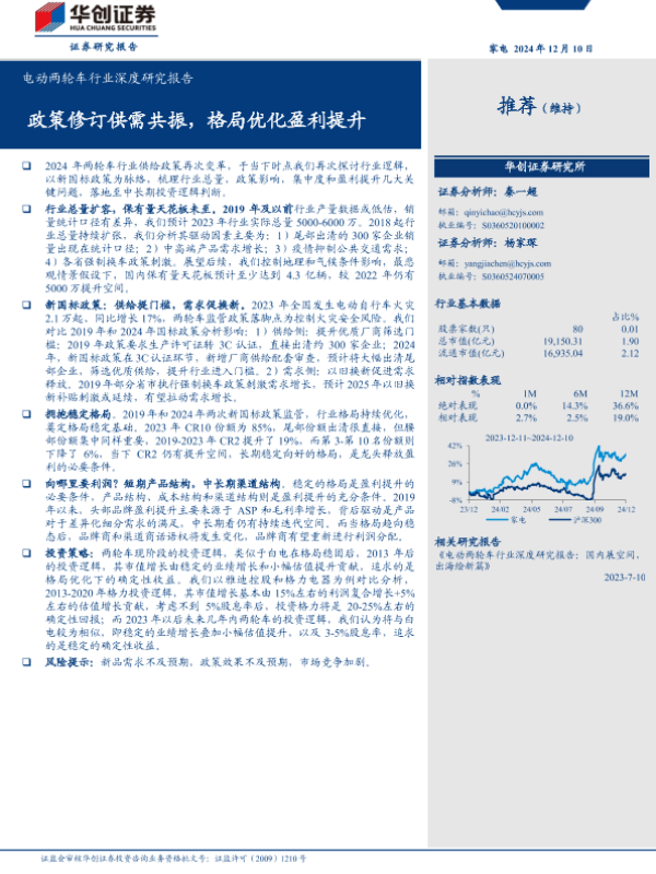 【华创证券】【20241210】电动两轮车行业深度研究报告:政策修订供需共振,格局优化盈利提升-27页 行业研究