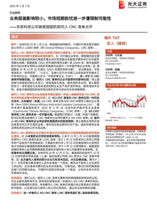 【光大证券】【20250107】海外TMT行业多家科技公司被美国国防部列入CMC清单点评:业务层面影响较小,市场短期担忧进一步遭限制可能性-12页 行业研究