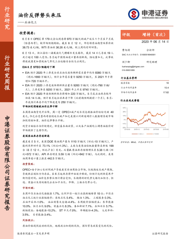 【申港证券】【20200614】20200614-申港证券-石油化工行业研究周报:油价反弹势头承压-23页 行业研究