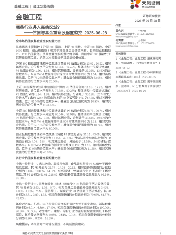 【天风证券】【20250628】估值与基金重仓股配置监控:哪些行业进入高估区域?-15页 证券期货研究报告