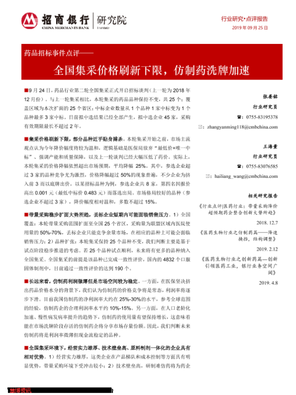 【招商银行】【20190925】药品招标事件点评:全国集采价格刷新下限,仿制药洗牌加速-3页 行业研究