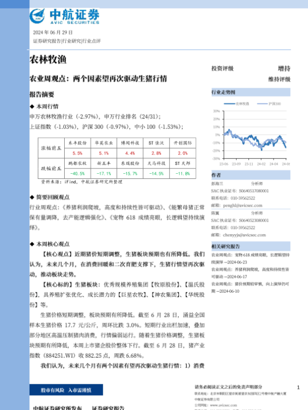 【中航证券】【20240629】农业周观点:两个因素望再次驱动生猪行情-13页 行业研究