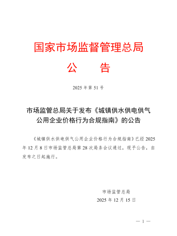 【国家市场监督管理总局】【202512】城镇供水供电供气公用企业价格行为合规指南-12页 指南