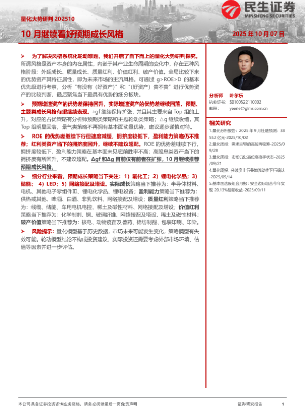 【民生证券】【202510】量化大势研判:10月继续看好预期成长风格-19页 证券期货研究报告