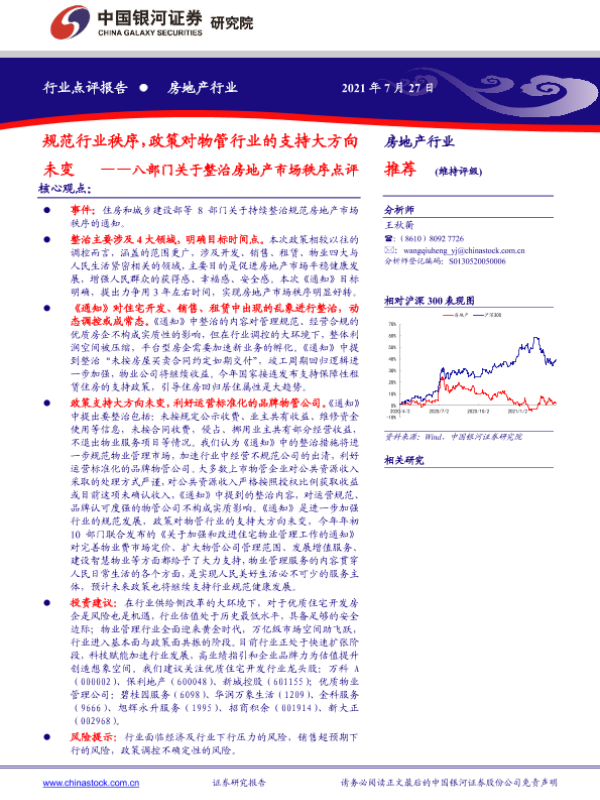 【银河证券】【20210727】八部门关于整治房地产市场秩序点评:规范行业秩序,政策对物管行业的支持大方向未变-4页 行业研究