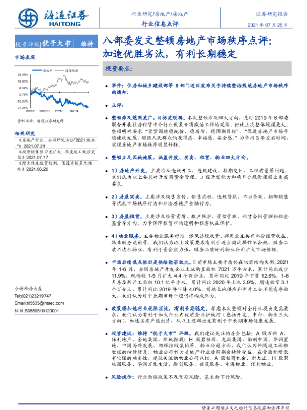 【海通证券】【20210725】八部委发文整顿房地产市场秩序点评:加速优胜劣汰,有利长期稳定-5页 行业研究