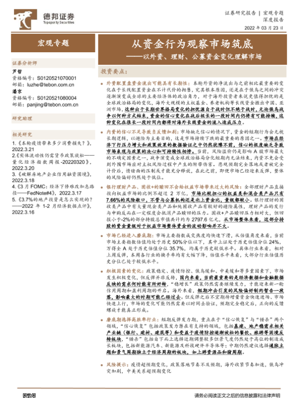 【德邦证券】【20220323】宏观专题:以外资、理财、公募资金变化理解市场,从资金行为观察市场筑底-21页 行业研究