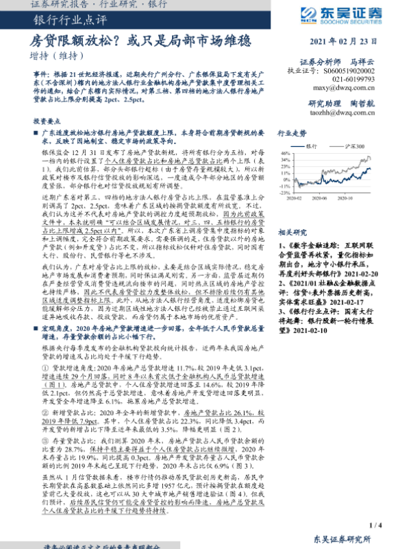 【东吴证券】【20210223】银行行业点评:房贷限额放松?或只是局部市场维稳-4页 行业研究