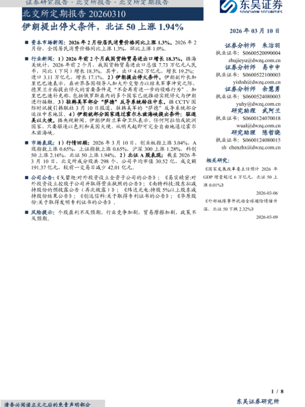 【东吴证券】【202603】伊朗提出停火条件,北证 50上涨 1.94%-8页 证券期货研究报告