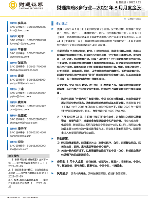 【财通证券】【20220729】策略&多行业:2022年8月月度金股-16页 行业研究