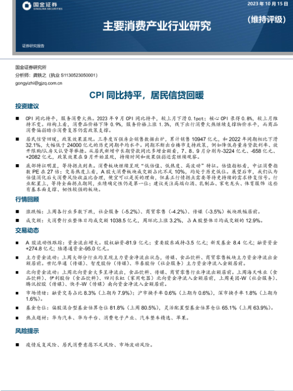 【国金证券】【20231015】主要消费产业研究:CPI同比持平,居民信贷回暖-18页 行业研究