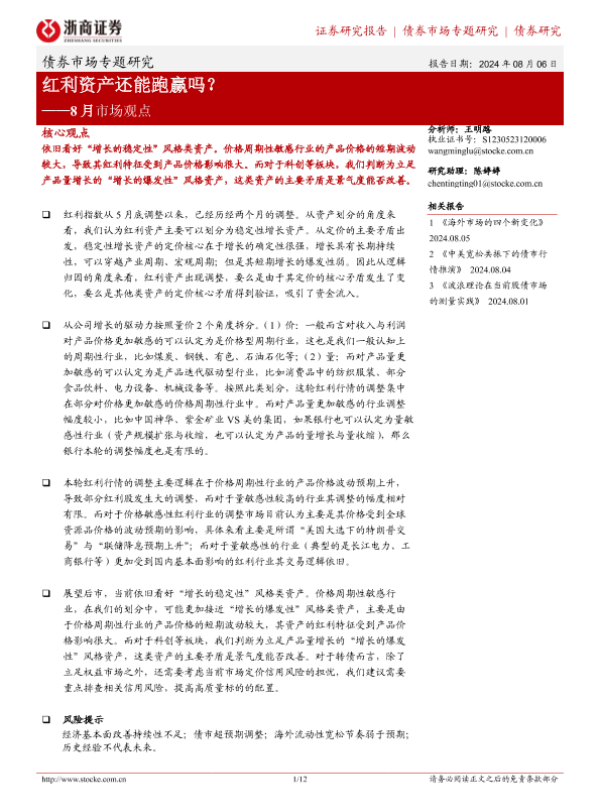 【浙商证券】【20240806】8月市场观点:红利资产还能跑赢吗?-12页 行业研究