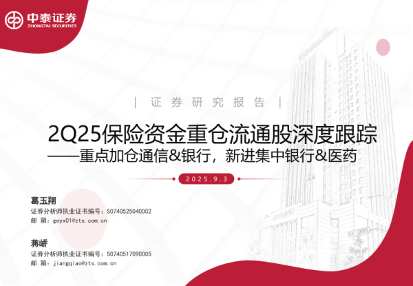 【中泰证券】【202509】非银行业2Q25保险资金重仓流通股深度跟踪:重点加仓通信&银行,新进集中银行&医药-39页 证券期货研究报告