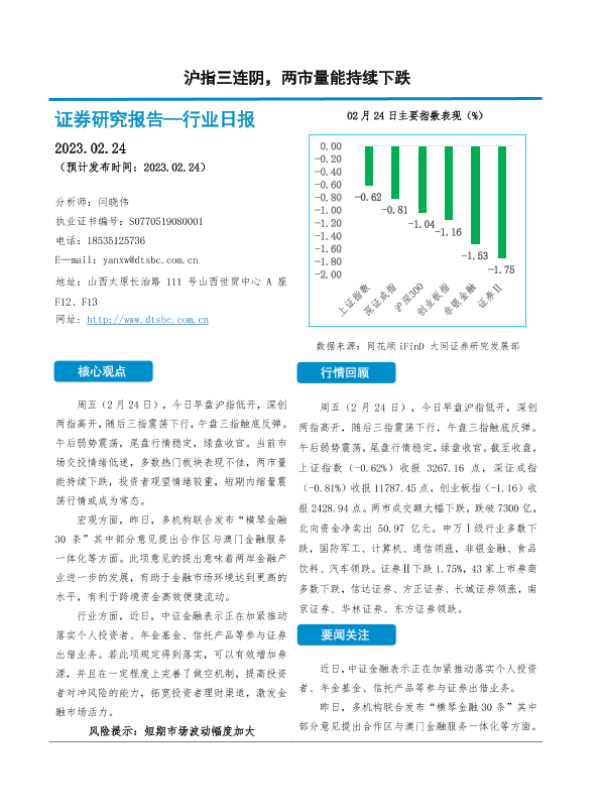 【大同证券】【20230224】沪指三连阴,两市量能持续下跌-10页 行业研究